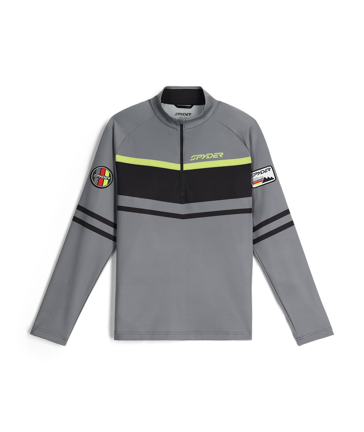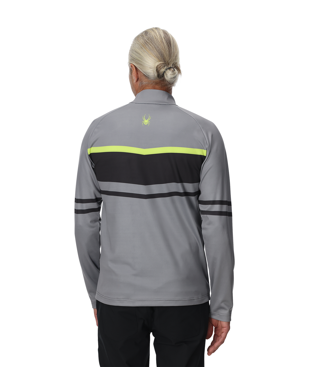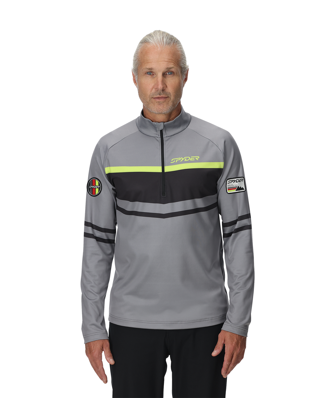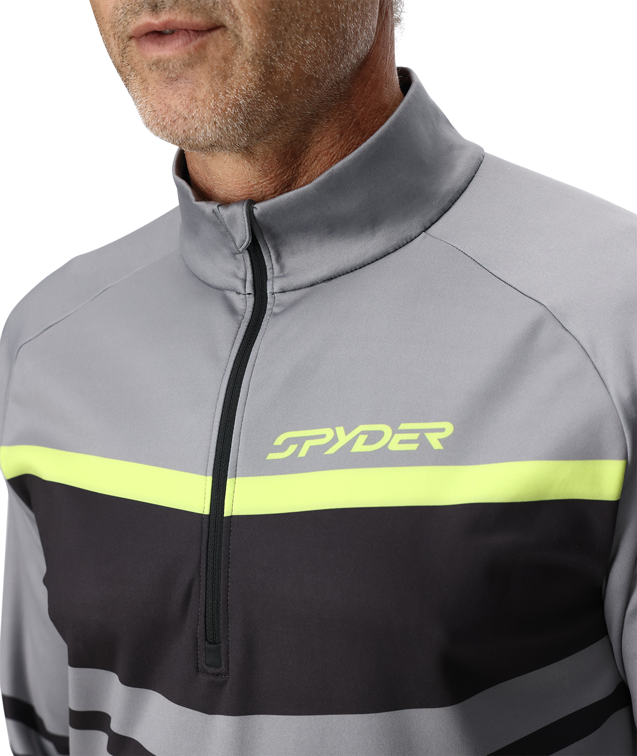The Legacy 1/2 zip t-neck, made from 83% polyester and 17% elastane stretch knit fabric, offers wicking properties alongside UPF 50+ sun protection. It features a YKK® center front zipper with a double-layer gusset behind it for added wind protection. It is enhanced with custom Spyder seasonal graphics and an interior locker loop.
