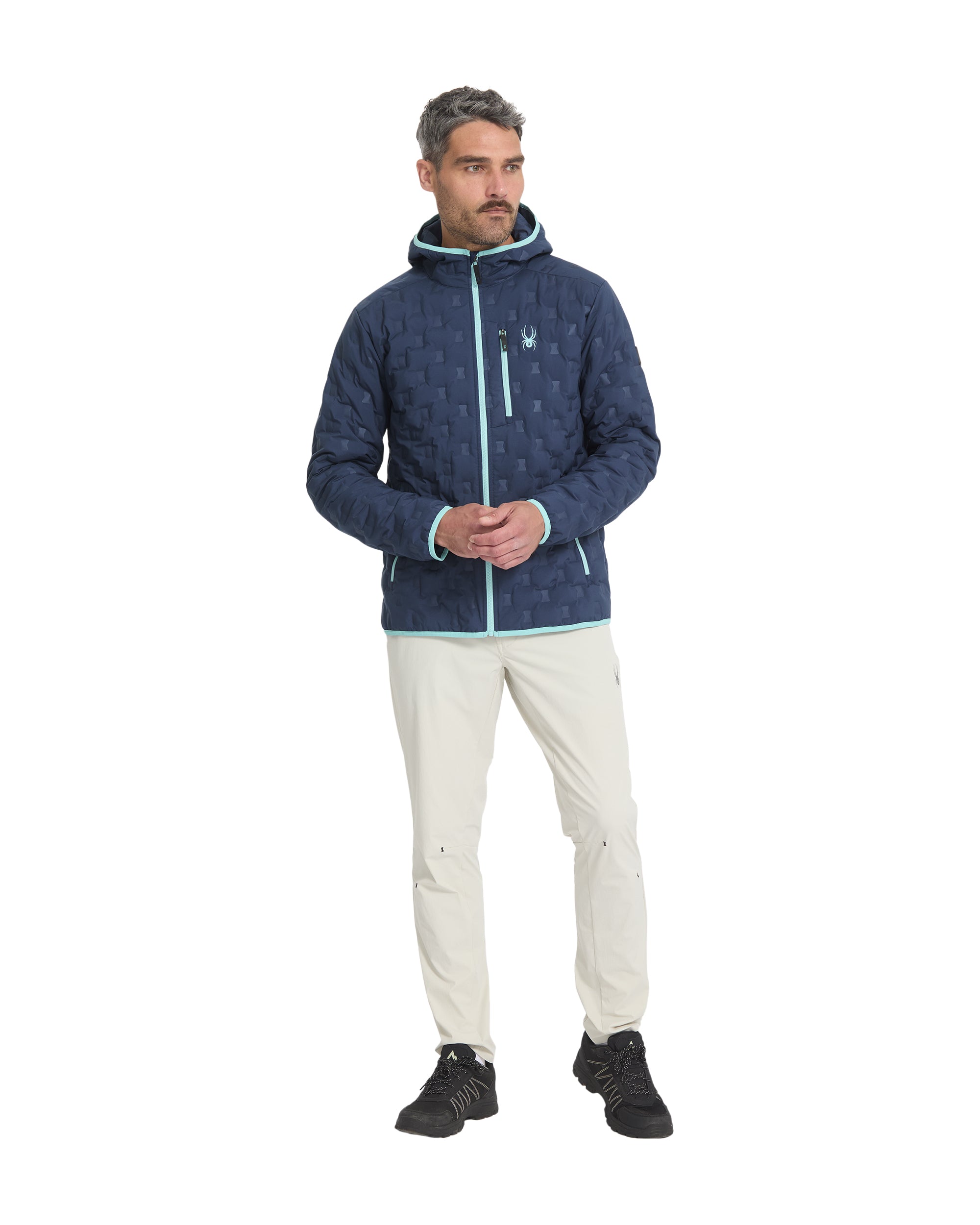 The Zenith down hooded jacket is designed for lightweight warmth. It is made from 100% recycled downproof polyester and filled with 700 fill duck down, traceable through Allied Feather and Down's trackmydown.com website. The jacket includes YKK® zippers at the center front, chest, and hand pockets, elasticized wrist cuffs and hem, and all-new custom 3D welded baffles.