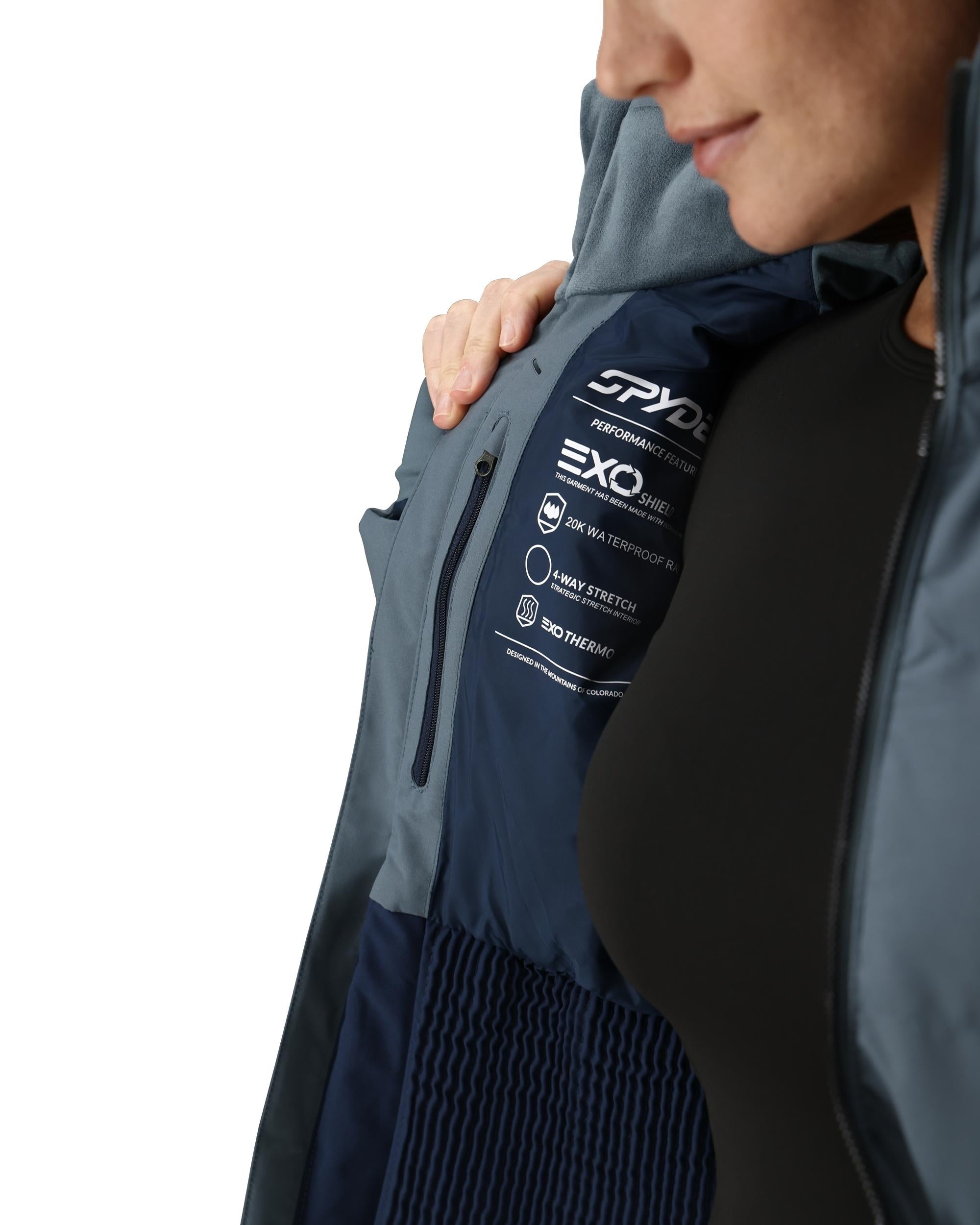 The Haven is the perfect versatile winter jacket with modern design lines and a feminine fit. It features Durable Water Repellent (DWR), 200 grams of PrimaLoft® Silver Hi-Loft insulation, and 4-way stretch EXO SHIELD nylon with a 20K/20K laminate for top-tier performance. The insulation and waterproofing on this classic Spyder jacket keep you warm and dry, while its longer length is stylish on or off the mountain.